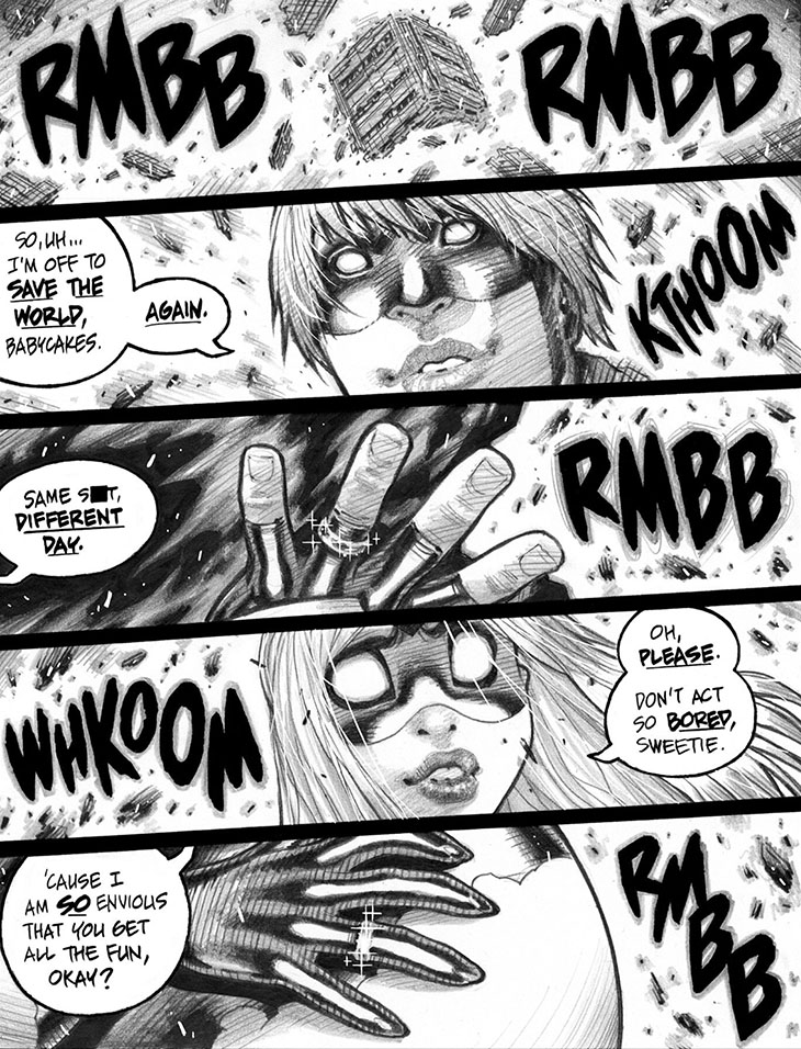 See those "glitter FX" around the rings in panels 3 & 5, and the (less conspicuous) hair strands in panels 2 & 4? Those were line art inked in black on overlays, then inverted to white after the scanned layers of original artwork were combined in Photoshop. This was, in effect, an attempt to manually reproduce via analog media an analogue for the "white line layers" that I positively adore using in digital media such as Clip Studio Paint and Photoshop. (In truth, 'tis no joke that I consider digital media's constant access to white linework to be one of the very best parts of working on the ol' iPad or Cintiq.)