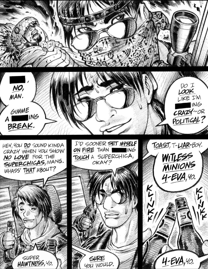 Panel 3: Never ceased to amuse me that some forum dudes online would get all upset when I’d have certain characters use the so-called “terminal yo,” as Q-Dog does here with “Super hawtness, yo.” What can I say, folks? The “terminal yo” cracked me up the first time I heard it used way back in the day, and still entertains me a fair bit nowadays. (That said, it’s used rarely and fairly archly in the series.) Besides, online critics, if the “terminal yo” is good enough for both Jesse Pinkman and Junot Díaz to use, it’s good enough for you, dumbasses.