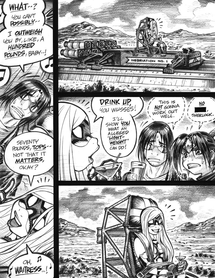Panel 2: If you might recall, a few pages earlier Ninjette declared, “You don’t want your imbibery to be a graceless, fratboyish rocket-sled ride into drunken oblivion.” Well, starting with this panel, we’re seeing a comically direct and on-the-nose metaphorical sequence depicting Emp’s ill-considered attempt to match the alcohol consumption of the much heavier Thugboy and much, ah, “drinkier” Ninjette. Yeahp, Emp is depicted as strapped into a rocket sled based on the one famously ridden at Edwards Air Force base in 1947-1954 by Colonel John Stapp and other test subjects. I’m reasonably sure, howeva, that Stapp never rode that rocket sled with a drink in his hand, as seen in panel 4. (I might be wrong, though.)