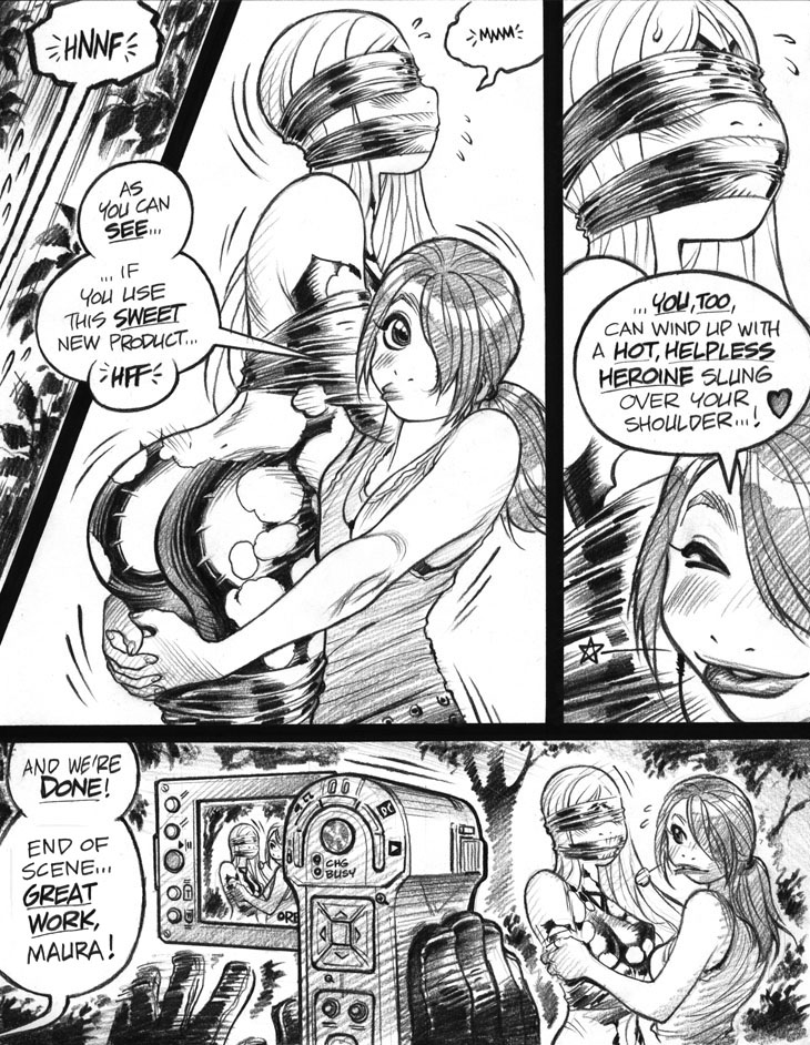 Panel 4: Yeahp, Treacherous Girl’s name is “Maura.” Doesn’t seem stunningly professional for the gloved fellow behind the camera to use her name in front of Emp, though. Also, enjoy a vintage 2007 videocamera, folks! (With the slightly cryptic label “BUSY” by one of its indicator lights, you’ll notice. I could go online and find out what that “BUSY” means, but I don’t really care.)