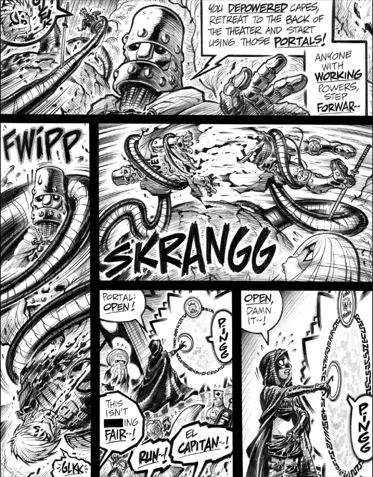 Panel 2: Aaaaaaaaand I just noticed that Decade-Ago Me forgot to draw the magic sword that was supposed to be driven through the top of Katana's head. Whoops, again!