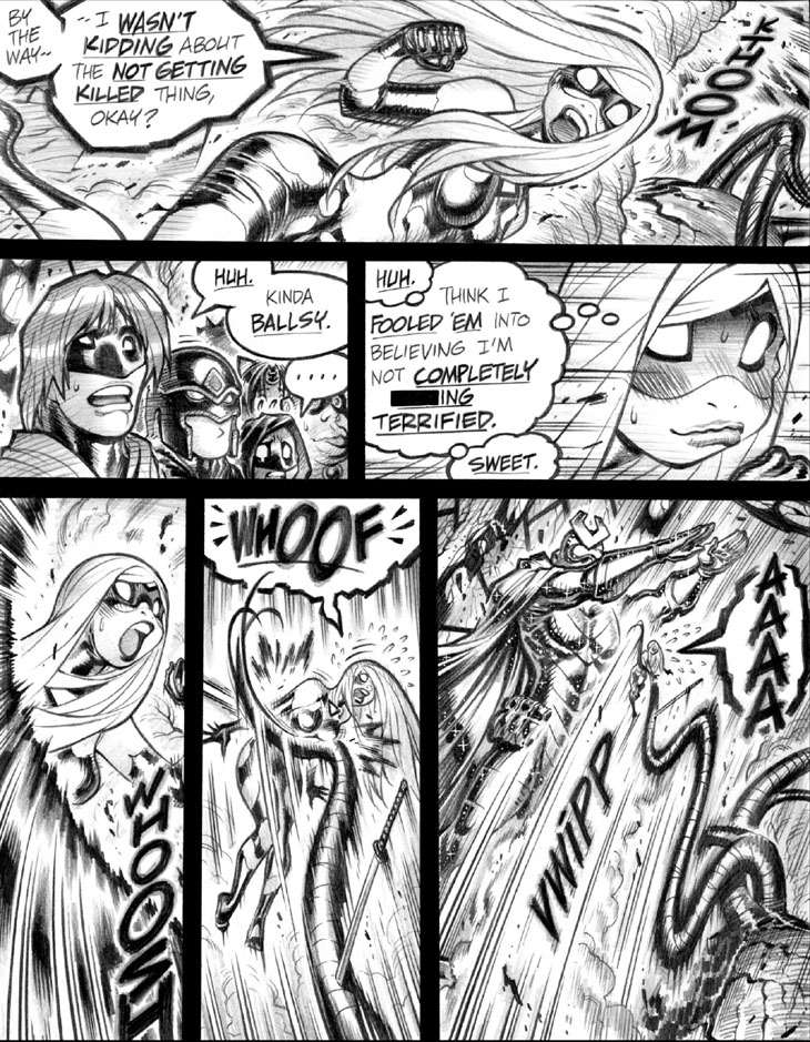 Panel 4: Once again, I had part of a sound FX clipped off by a lower border after the page was scanned and formatted. Oops! Then again, the FX presumably reads decently enough even with a nipped-off H, given that I hadn’t noticed this problem even once over the past frickin’ decade. (My apologies, howeva, if you thought this FX actually read as “WHOOOS4.”)