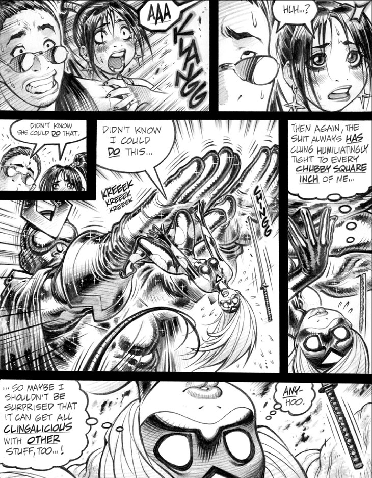 Panel 3: A new power is manifested by Emp’s ever-enigmatic supersuit. Huzzah! For the record, this “clingalicious” riff is based on a gecko-emulating function of the Dirty Pair’s uniforms which, as of my final, out-of-print DP miniseries (Dirty Pair: Run from the Future) and beyond, had developed all sorts of increasingly exotic ultra-tech abilities. (Emp’s suit will eventually manifest more and more functions derived from largely unused DP ideas, but that’s further down the road.) Only after this volume did I realize that anyone might consider this “clingy Emp” bit to be imitating Marvel’s Spider-Woman, to whom Emp’s suit arguably bears a resemblance. Unintentional, I assure you!
