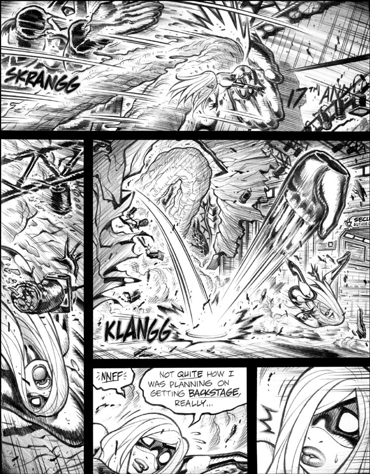 Panel 1: Sigh. Due to the rotation of upside-down Emp to upright as she was struck, Decade-Ago Me lost track of which g-d statue hand she was supposed to be clinging to. Whoops! A truly annoying error on Decade-Ago Me’s part, which I didn’t notice until well after publication. Adding annoyance value to this panel is the fact that, in this shot, you can clearly see that both appendages visible on said statue are left hands. Whoops again! For the record, the hand duplication was possible because I mask off large portions of the panel to avoid smudging, which would’ve preventing me from noticing the problem.