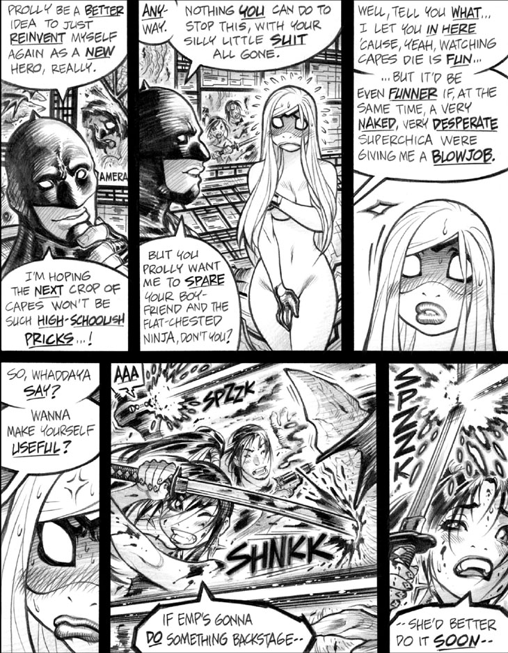 Panel 4: I might actually have considered giving that manga-style “popping crossed veins” image in Emp’s hair(?) a wee sound FX, such as “SKRKK” or the like. Just as well that I didn’t.