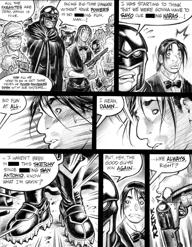 Panel 5: Attentive readers might recall this distinctive footwear—which garnered this unnamed cape the unofficial nickname “Cap’n Boots”—from a San-Antonio-set flashback to Thugboy’s shady past earlier in the volume.