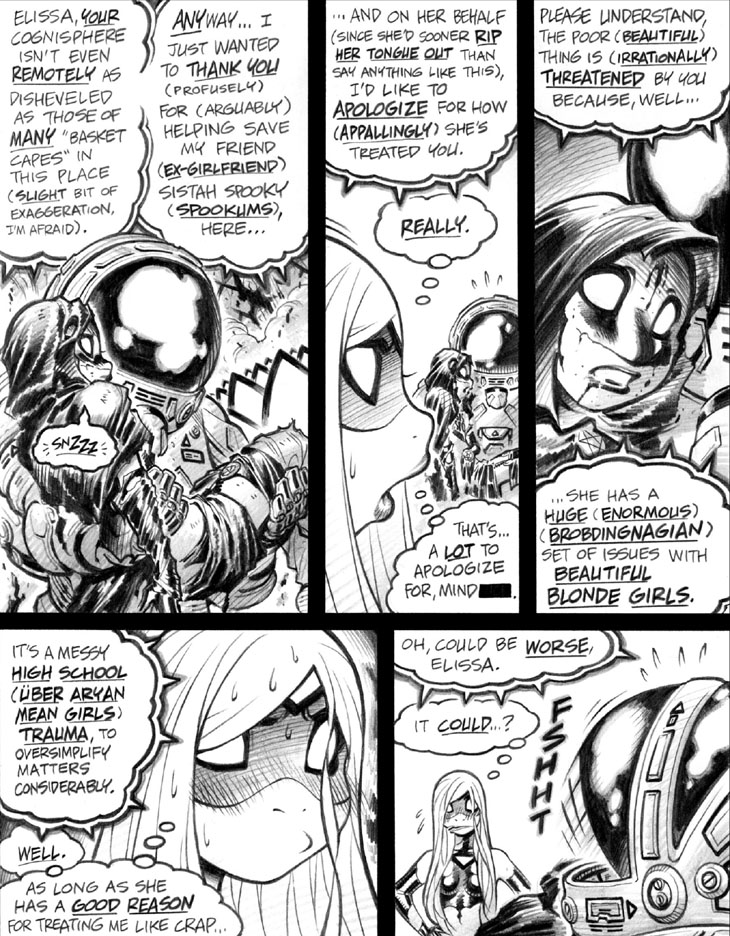 Definite Overdialoguing Alert on this page, I'm afraid. At the very least, I should have trimmed back Mindf**k's panel 1 thought balloons quite a bit, as only the second one is really relevant to this scene. Still, the character's parenthetical compulsive honesty amuses me to no end, even if there's too damn much of it in this sequence.