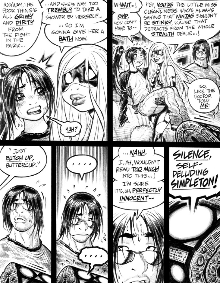 Panel 2: Not a fan of the folds and wrinkles on Ninjette’s shirt, here, which are very much an overly stylized visual riff that’s a straightforward sign of me just kinda hacking out clothing without bothering to look up any photoreference. Not that I necessarily need to be using reference for every g-d thing—nor do I necessarily have the time to do so—but sometimes drawing “straight off the dome” doesn’t result in ideally acceptable results. Oh, well.
