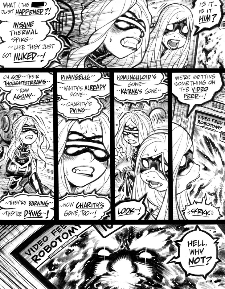 Panel 3: And yeahp, here are the individual names for the conjoined characters collectively supranymed as “Divangelic,” as I mentioned in passing a few days ago. (Even though I really thought I'd named them "Devangelic" with an E instead of an I.) Not 100% sure if Vanity and Charity were their separate supranyms or theoretically their proper names; long-time readers will be aware that they spawned from a single, normal-human woman who presumably would’ve had a wholly different name. (For webcomic readers, this will get clarified in the opening scene from Empowered vol. 8, roughly 450-odd pages from now.)