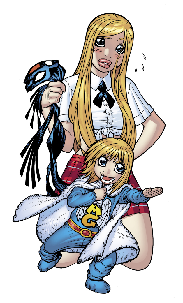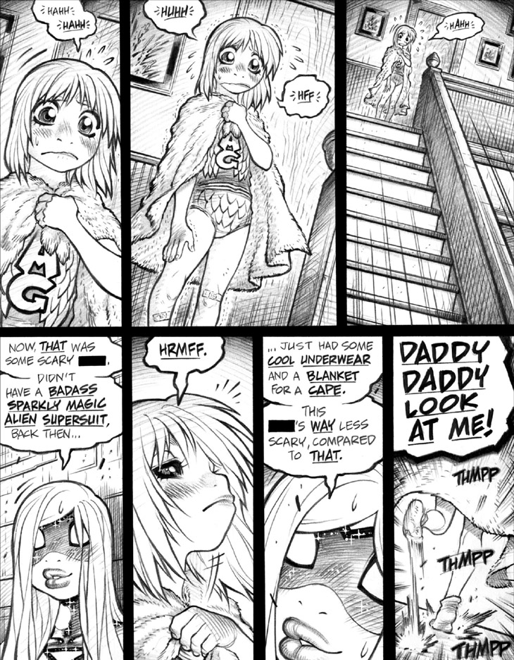 Panel 2: Note also that I did not want to show Age 4 Emp in her underpants on the back cover of Empowered vol. 5, so I instead gave her a footie-pajama version of the outfit.