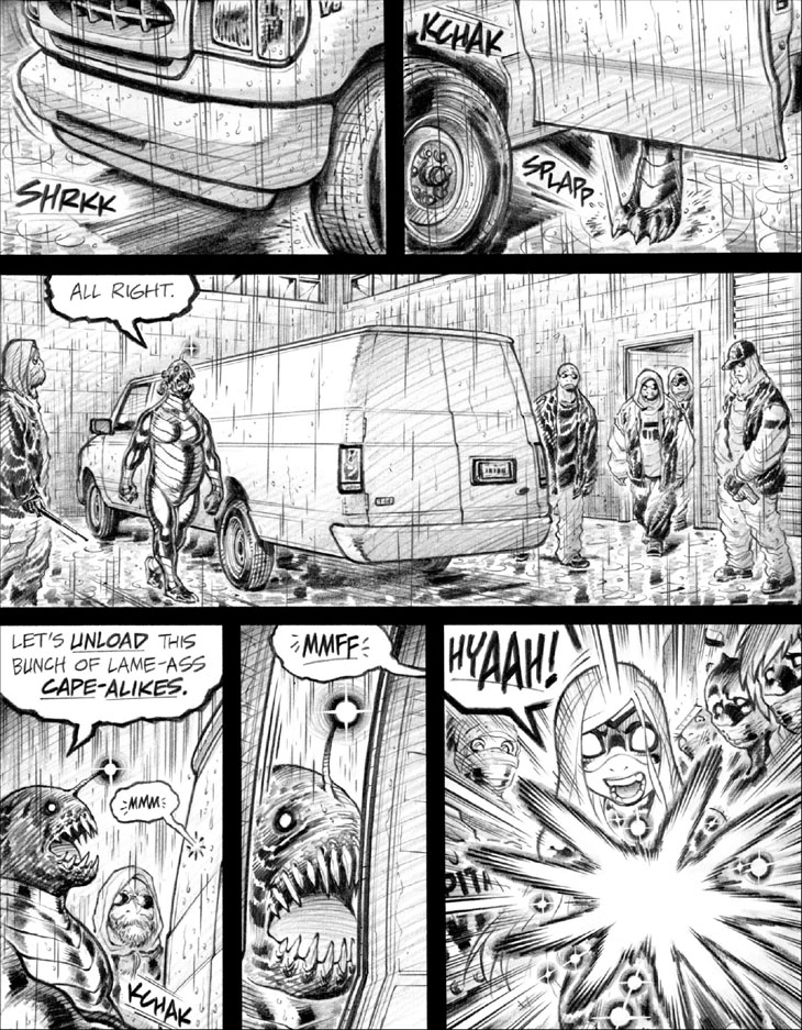 Panel 6: Here, a very unusual take on Emp’s VORPP powers flashing to life, seen a fraction of a second before the actual VORPP sound FX is heard. (For the record, I once had Emp describe her VORPPing as “deadly jazz hands” in an unpublished Empowered prose project, which remains my favorite description of the phenomenon.)