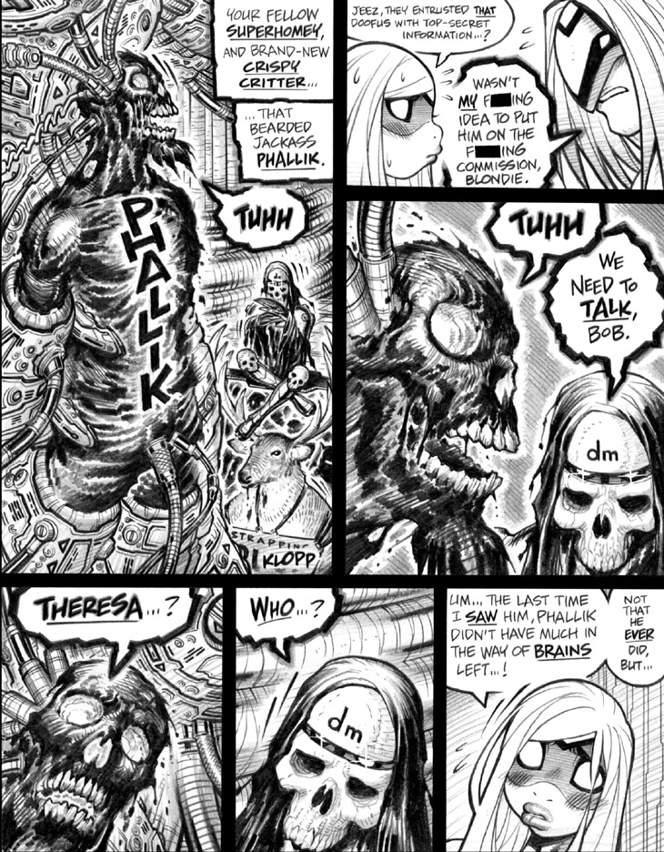 Panel 4: Just as he did about 70-odd pages ago (which, for some g-d reason, today's commentary formatting will not allow me to link to), poor Phallik is indeed blurting Sistah Spooky’s real name for some currently unclear reason. Not a big SPOILER to tell you that the cause of this peculiar behavior will be revealed at some point in this volume’s overall narrative.