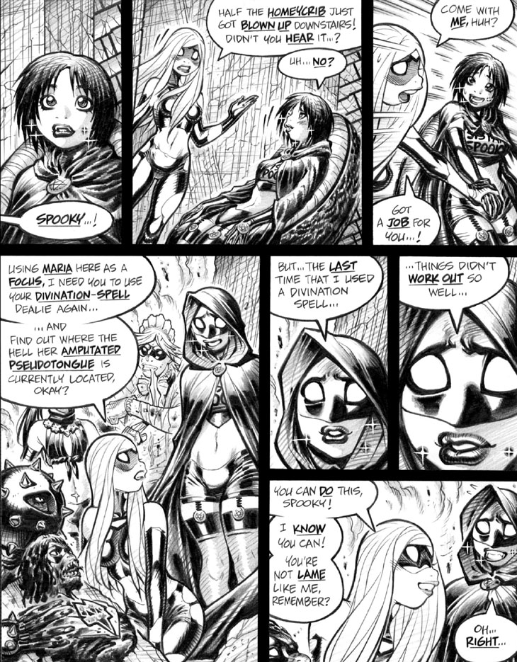 Panels 5-6: Remember, the last time Spooky used a divination spell was during the beginning of Empowered vol.5—and things undeniably did not work out terribly well by the end of the book. (“Three seconds too late” and all that.)