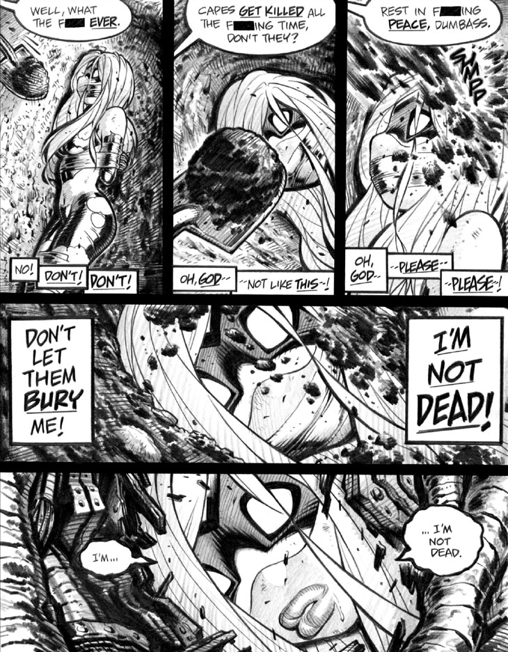 Panel 5: Aaaaaand we’re back to real-time action now, with the cryptic and notably enigmatic burial scene wrapping up. That odd sequence wound up being one of the series’ most notable dangling plot threads, as I’ve never quite gotten around to clarifying exactly what happened in it. I’d hoped to address the scene more fully in Empowered vol. 8, but ran outta pagecount; then in vol. 9, but really ran outta pagecount; then in vol. 11, but ran outta pagecount and only featured a single image portraying the apparent immediate aftermath. (No SPOILERS, please, as the webcomic will eventually catch up to that point.)