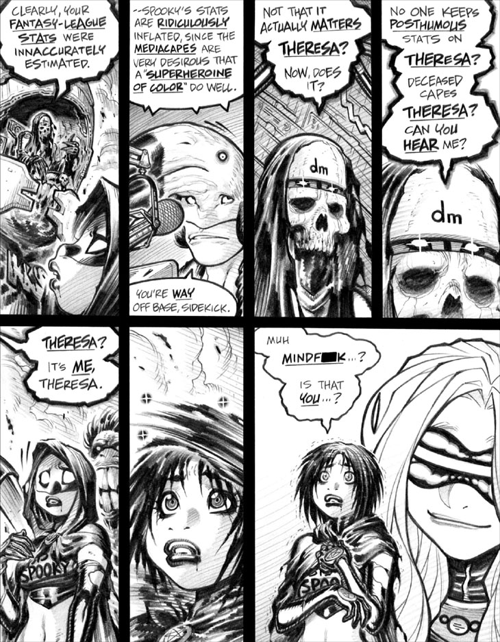 Panel 1: Aaaaaand after the previous three days of cryptic Emp flashback, we suddenly jump back to the real-time action with Deathmonger and Spooky. Yeahp, webcomic serialization isn’t always ideal for the book-based storytelling of this series.