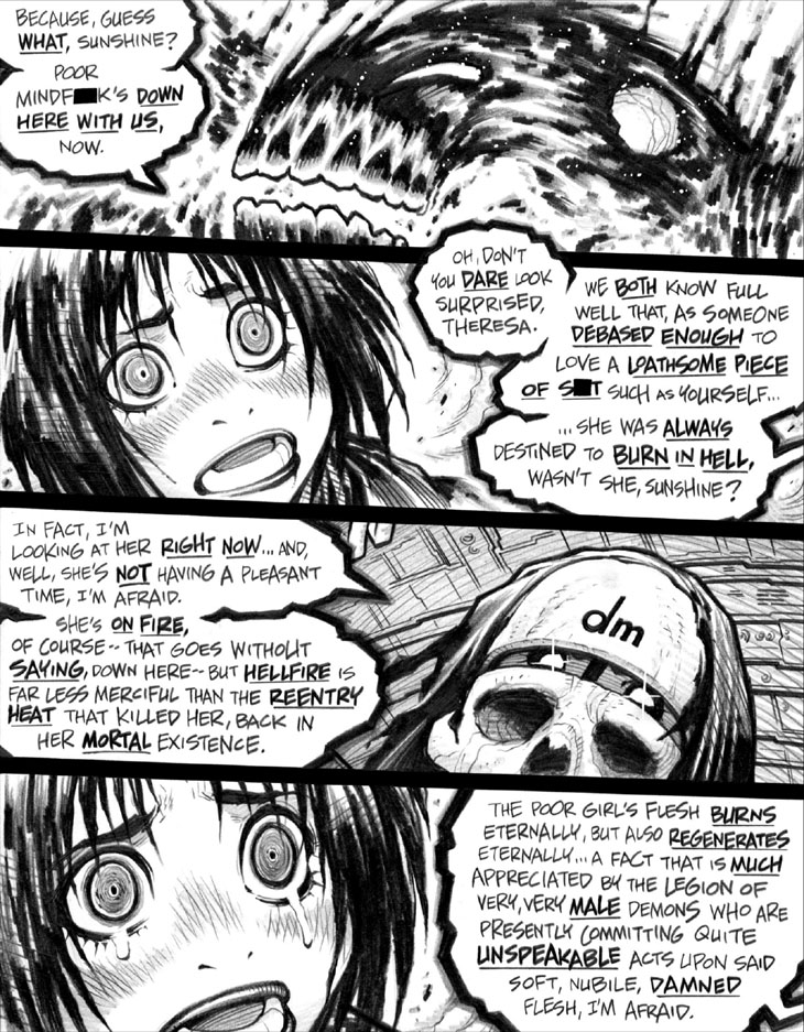 Not sure that this obscure lettering point is at all clear in this page, but the font used for the Infernal Service Provider’s dialogue is supposed to be conventionally consistent and straightforward, whereas the font used for Deathmonger’s dialogue is lettered with constantly varying sizes, in an attempt to convey the unevenness and wavering quality of this villain’s particular form of Superdead speech.