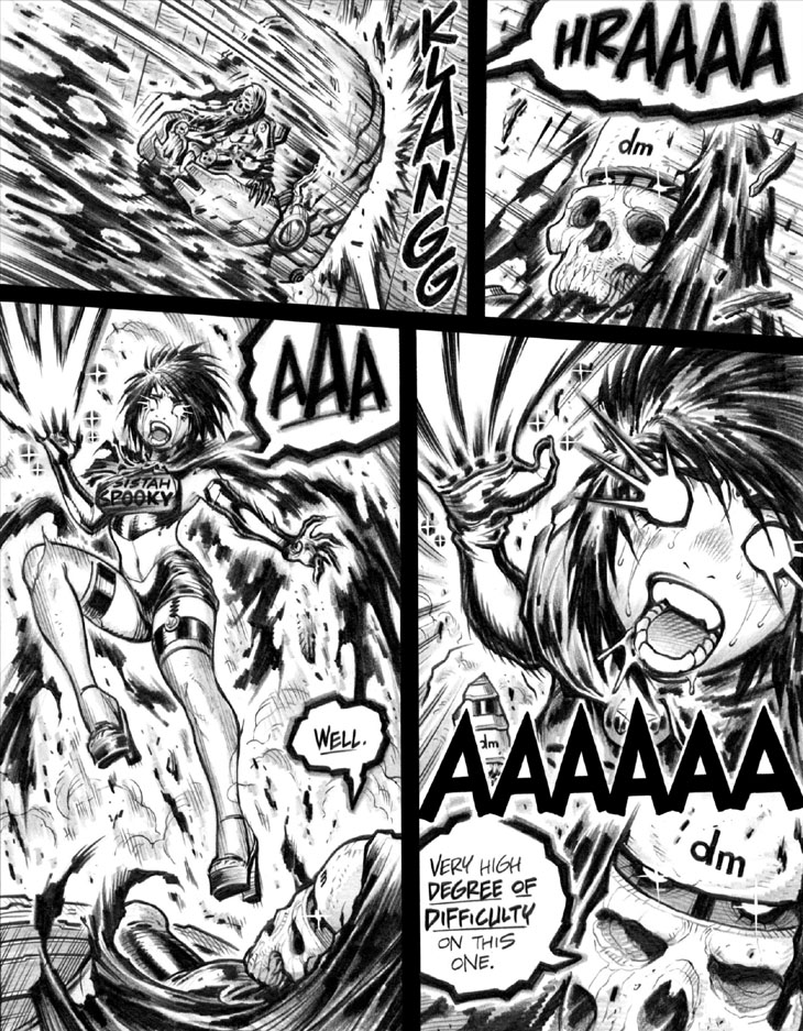 Panel 5: Another unusual lettering choice in that Spooky’s inarticulate yell (AAAAAA) is rendered as a gutter-bridging element without any word balloon. Glad to see Decade-Ago Me trying something different!