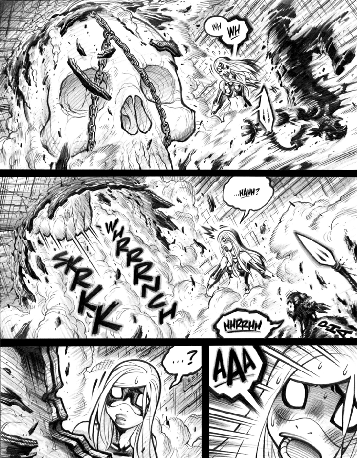 Panel 1: Come to think of it, the detailed model of a human skull that I used for reference in this scene was not, in fact, bought for use in Empowered. Rather, I just remembered that I bought it way back in 1995 as reference for the skull-intensive cover illustration of Dirty Pair: Fatal but not Serious #1.
