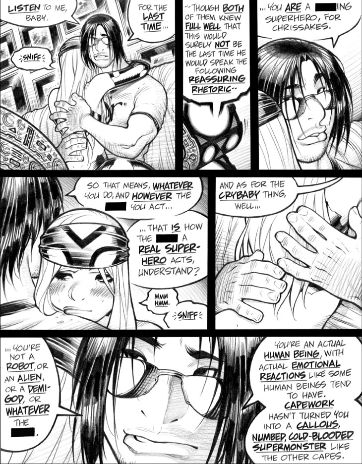 Panel 2: I do rather like how this mid-sentence cutaway to the Caged Demonwolf worked out. Nicely done, Decade-Ago Me! Now, try to avoid the g-d overdialoguing,okay? (SPOILER ALERT: Decade-Ago Me does not, in fact, wind up avoiding the g-d overdialoguing.)