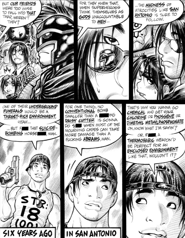 Panel 5: Ha! Hadn’t recalled that, for the benefit of the casual reader, Thugboy’s dialogue brings up the idea that a Daisy Cutter is presumably an explosive weapon of some sort; later in the volume, we might just meet a cape rocking that supranym and an explosive power set. Military-hardware otaku will, of course, know that “Daisy Cutter” is the slang term for the BLU-82B 15,000lb(!) bomb.