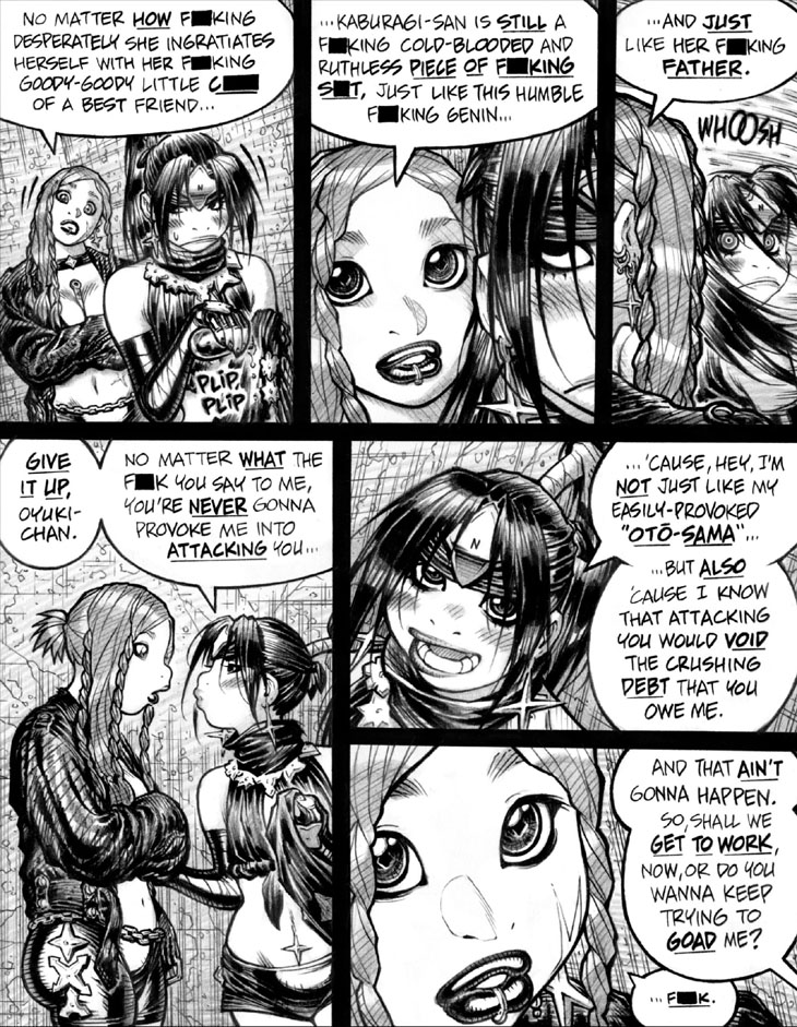 Panel 4: Behold, a rare acknowledgement of comparative height among Empowered’s female characters, as F**king Oyuki-chan is supposed to be a fair bit taller than Ninjette or Emp. (I really should do a g-d height comparison chart for the cast someday.)