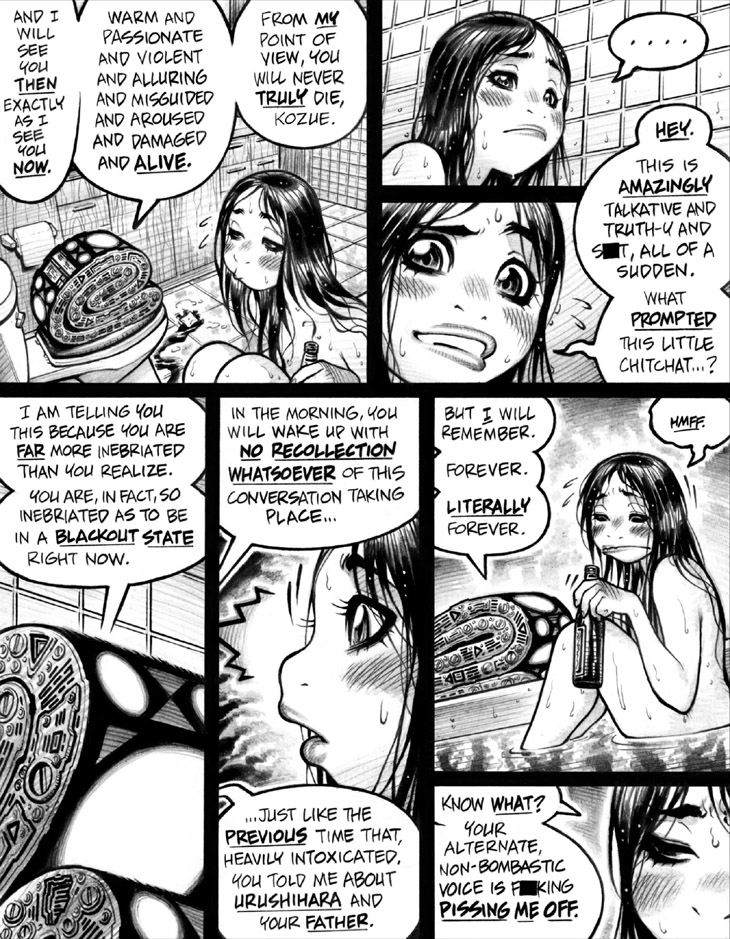 Panel 4: So close, so close—but adding that second word balloon at the bottom of the panel makes me wanna sound the dreaded Overdialoguing Alert. Given the importance of this scene, I really should’ve added more pagecount so as to avoid text-density pile-ups like this one. Pretty sure, though, that by this point Decade-Ago Me was thinking, “Gotta wrap this up! Wrap it up, now!”