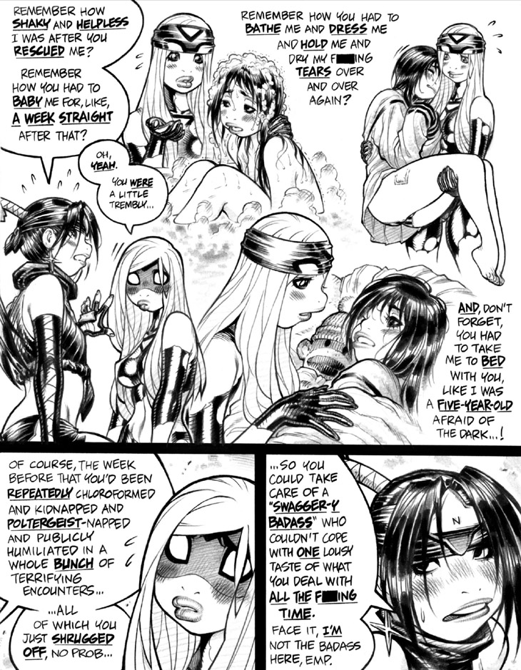 Note also that the rolling back of Emp's mask doesn't quite make sense, but is a visual riff I've been repeating just for the hell of it ever since the first time I drew it on a whim way back in vol.1. (Sorry, no link, as this week's links have all been a g-d disaster due to a technical issue.)