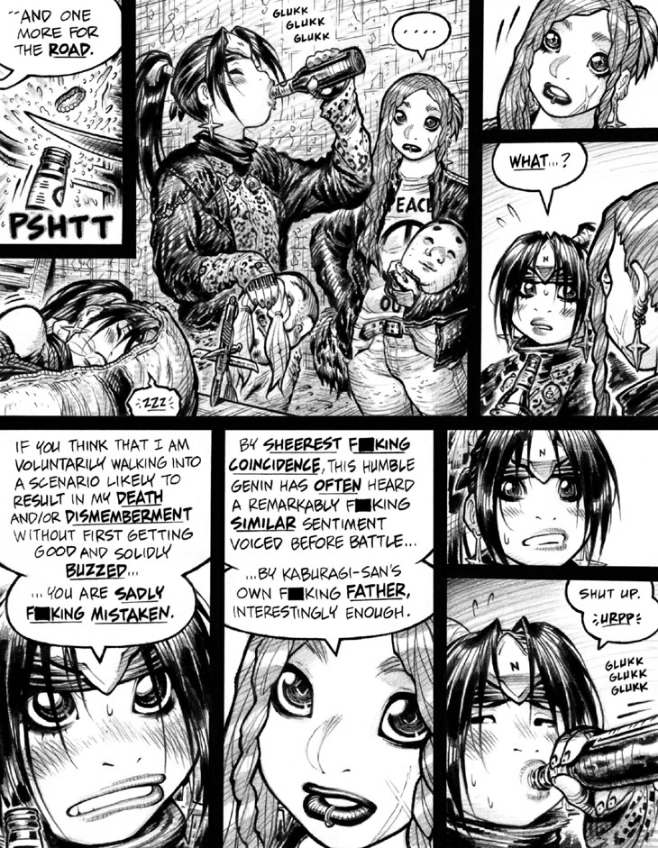 Next week, we jump right back into the present-day climactic action as Ninjette battles the final trio of Ayakami ninja. Don't think it's a major SPOILER to hint that things get pretty g-d rough for our "good and solidly buzzed" heroine.