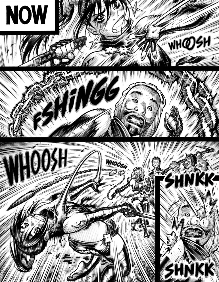 Panel 1: I have extraordinary difficulty hand-lettering "straight," symmetrical fonts like this caption's "NOW"; honestly, I just should've worked up a Photoshop text printout or had Dark Horse Production generate the font.