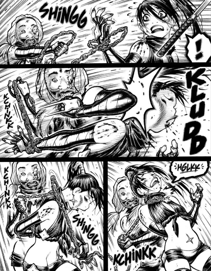 Panel 1: This move was a callback to a moment from vol.3's previous Ayakami ninja fight in which a foe surprised Ninjette with a chain-based disarming strike.