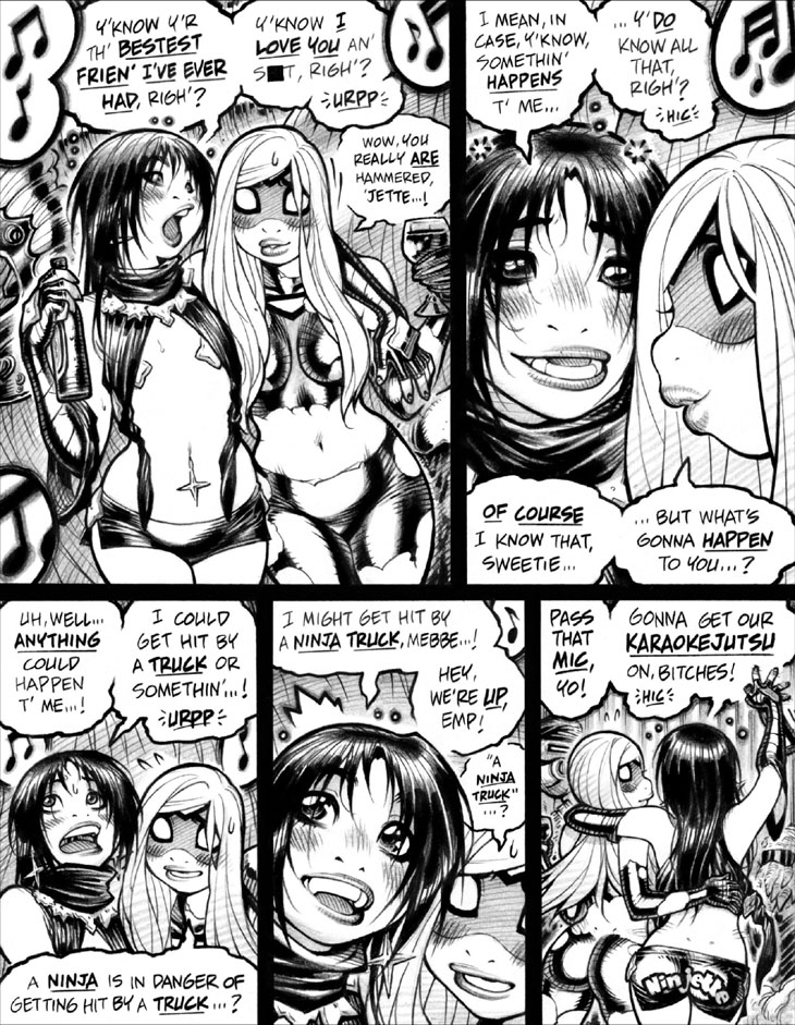 Aaaand it's time for yet another of Empowered vol. 7's many, many abrupt timeframe/scene changes, as we briefly cut away from Ninjette getting her butt kicked in the present for a quick, one-page flashback to a highly inebriated Kozue and Emp at Cape Karaoke Night. Tomorrow, back to the painful, present-tense aftermath!
