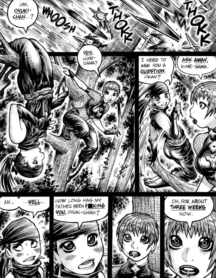 Panel 2: Gotta say that Teenage Oyuki-chan's look and costume worked out pretty well. Note also that she was indeed addressing Ninjette as "Hime-sama" (princess) back in these days.