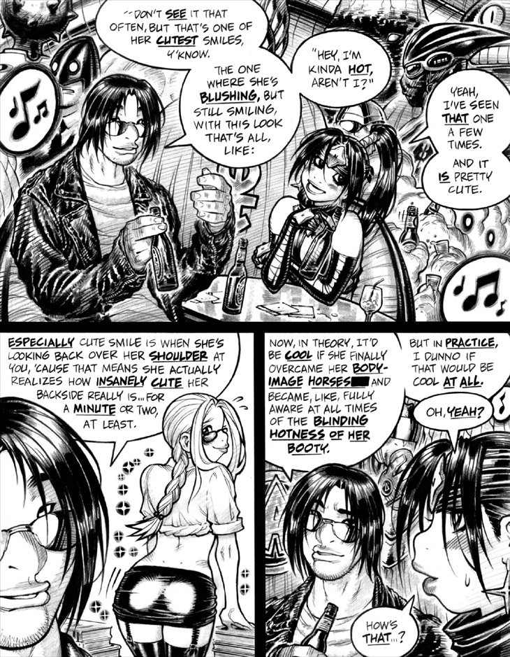 Panel 2: Why, just yesterday I was blithering about Ninjette’s (ahem) “unrealistically” clinging shorts, and mentioned that I am fully capable of depicting “realistically” clinging clothes—such as Sexy Librarian Emp’s skin-tight miniskirt seen here, which was very likely photoreferenced. My point yesterday was that I couldn’t see how “buttshots” with realistically clingy clothing were any less objectionable than buttshots with unrealistically clingy clothing.