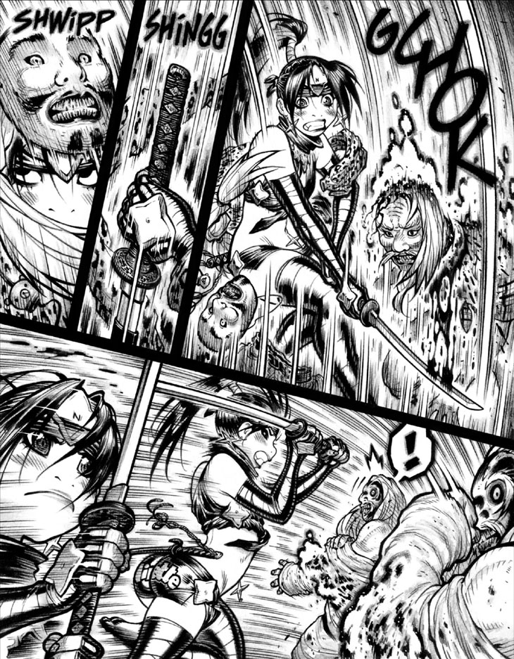 Panel 3: A rigorously photoreferenced sword-wielding pose for Ninjette, here. Two-handed katana poses are especially tricky to draw, as getting that g-d support hand and arm correct can be maddeningly difficult. (Along the same lines, single-handed pistol poses are much easier to depict than two-handed rifle poses.)