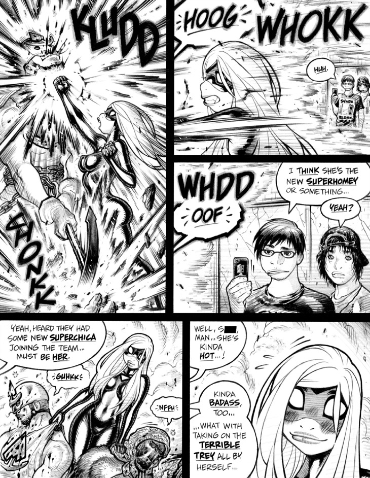Panel 5: In Empverse continuity, this constitutes an early appearance of the visual riff of Emp’s mask going into “blush mode.” (This might actually be a bit of a continuity error, as I don’t think I started drawing the “blushing mask” dealie until midway or so through the series, and this scene is supposed to depict a pre-Empowered vol. 1 timeframe.)