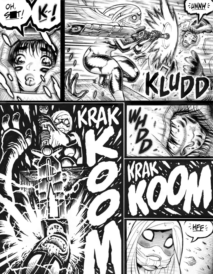 Panel 2: "KLUDD" is one of my favorite impact sound FX, but I strongly suspect I cribbed it from l'oeuvre de Frank Miller. (Same deal with panel 3's "WHDD".) My sound FX choices are quite frankly very, very repetitive, but the reality is that only a (very) limited range of written-out onomatopoeia "sound" acceptable to the exceedingly inscrutable algorithm in my head that determines which FX pass muster to me.