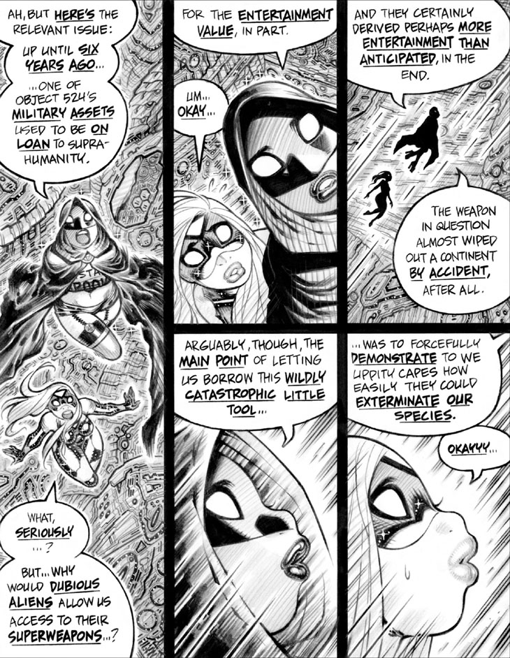 Also, regarding Emp's dialogue, I've noticed something interesting as I'm writing Empowered vol. 12—namely, that I'm writing Modern-Era Emp with much less usage of ellipses ("...", or here, "...?") ending her sentences, as she speaks with a greater degree of firmness and confidence. As with much of the development of her character, this was an organic evolution, and not something I deliberately planned out ahead of time.