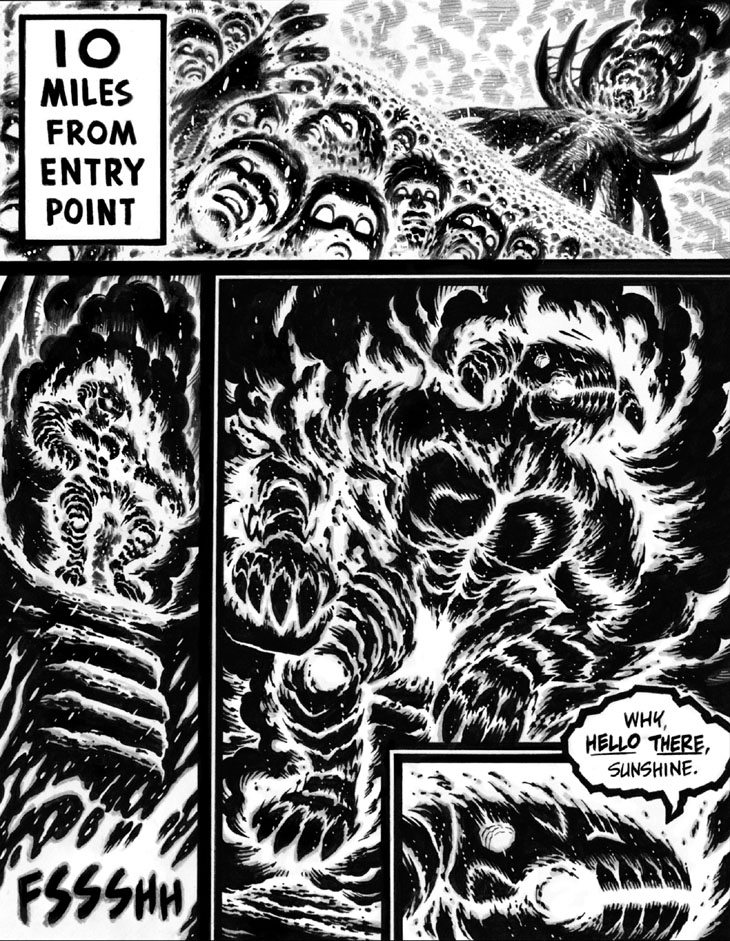 Panels 2-4: As I presently struggle with drawing-hand issues after f**king up my index fingertip a week ago, it's good to look back and see that even hyper-productive 2013 Me was having to take proactive steps to avoid stress and strain on my hand. Namely, the Infernal Service Provider and his environment were rendered entirely in Sharpie ink (with some pencil shading afterward) to make things easier on myself, as opposed to the wholly graphite-based grinding used to depict him in his earliest appearances.