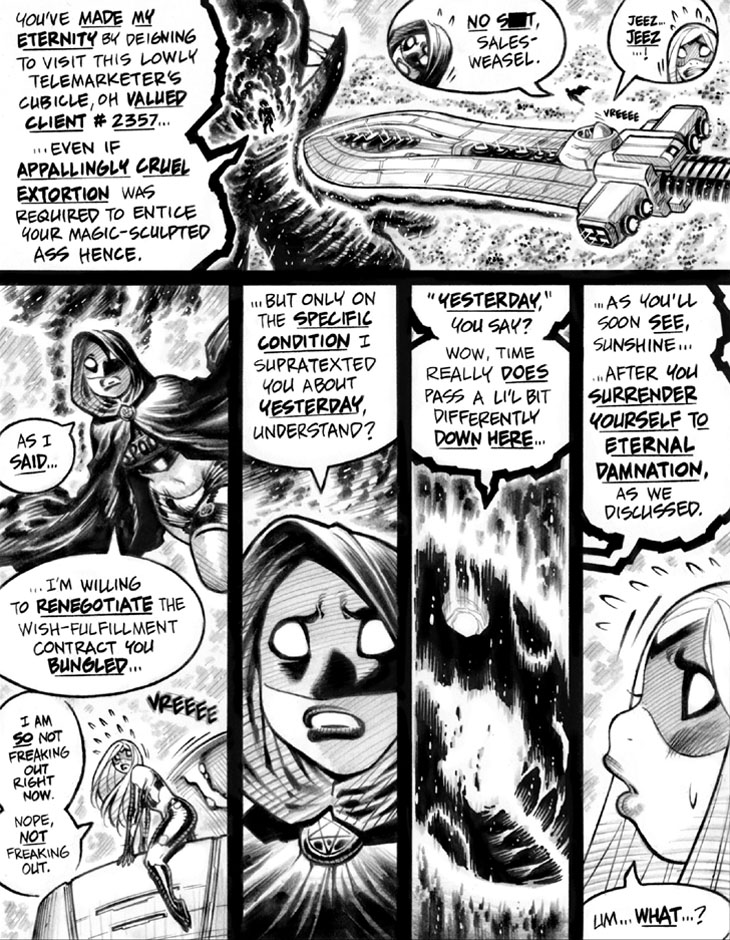 As I sit here able to type (hunting & pecking with my middle finger) but not able to draw due to index finger pain, I'm reminded of the dozen or so other chronic but normally transient drawing-hand pains that periodically afflict me. One of the more rare and exotic hand issues cropped up near the the end of this story as, after months of high-speed production and hardcore art grinding, a patch of skin on the side of my hand would just... wear out.