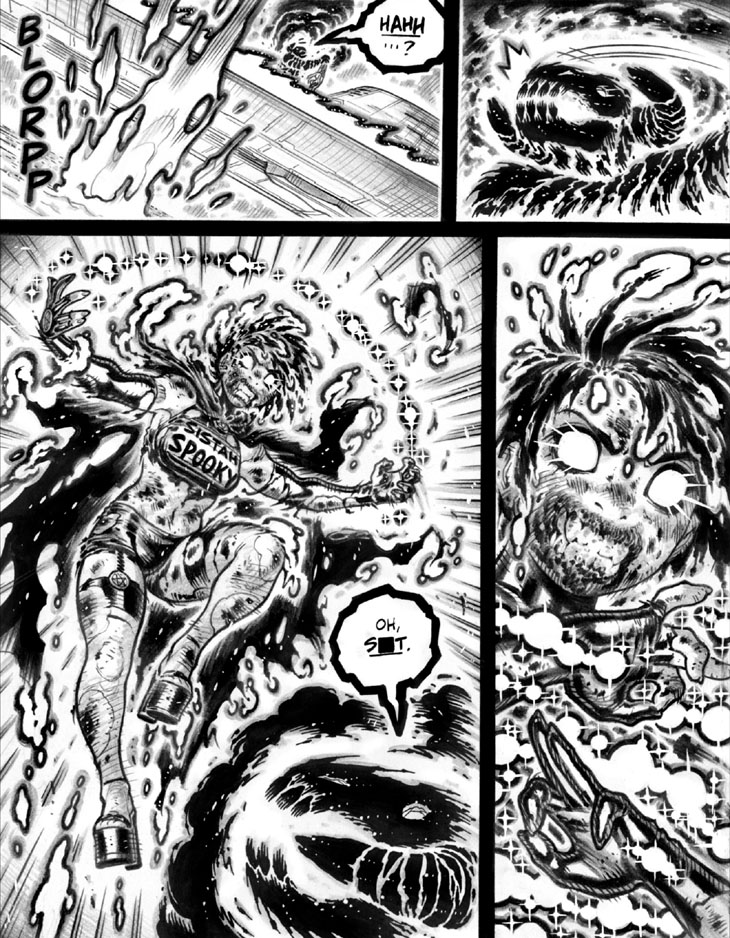 Panel 4: TBH, Spooky's fairly cartoony, exaggerated dentition doesn't help "sell" that she's had her lips burned off, but as with most of the gore (or "gore") effects I bother to draw, I'm not at all interested in exploring realistic depiction of grievous injuries.