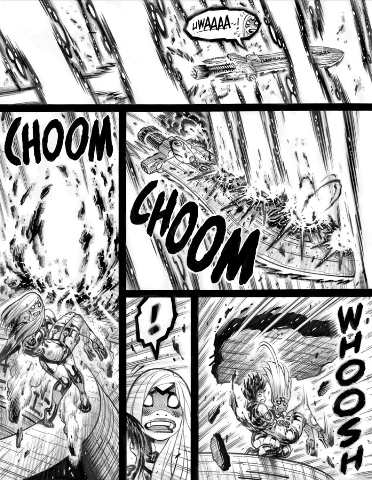 In any event, kudos to 2013 Me for making an effort to introduce sprawling scale to an Empowered scene, which is something I didn't then and still don't don't do all that often, mainly because that approach involves laboriously drawing a veritable s**tload of backgrounds. Writer Me often contemplates such imagery approvingly from a scripter's airily detached, 30,000-foot remove, but Artist Me always feels differently as the hapless schmo who has to actually carry out the hours and hours of gruntwork necessary to fulfill such grand, sweeping plans.