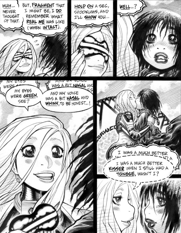 Panel 5: Belatedly occurs to me that Spooky would theoretically tower over Mnemonic Construct Mindf**k due to her high-heeled platform shoes, much as she should've been doing in relation to Emp. ("Whoopsie," to once again quote the Studio Guy from the Pitch Meeting videos.)