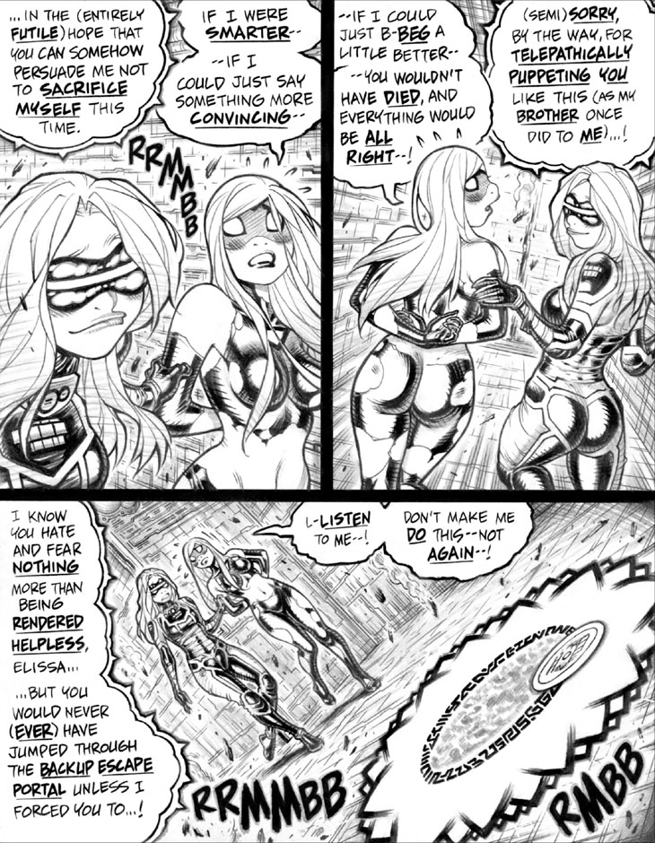 Panels 1 & 2: As Is my unconscious wont with most characters, note that Mindf**k's hair got a whole lot longer over time, to the point that her blonde mane is almost as long as Emp's. Not sure why this happens, but there you go.