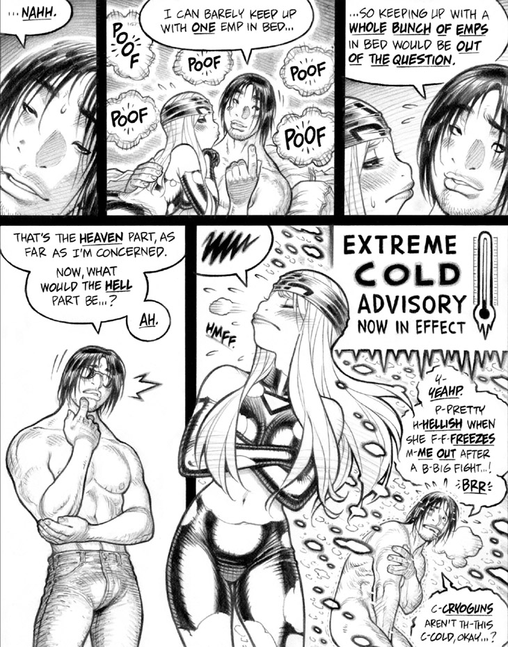 Panel 3: Ehh, bit of a mistake on my part by having Thugboy wimp out so quickly in the face of a semi-meta bedroom challenge. Looking back on it, he might well be correct about the difficulty of dealing with an "Emp en masse" scenario, but I'm sure he'd like to give such a daunting situation "the old college try, " if you will. (Er, not that he went to college.)