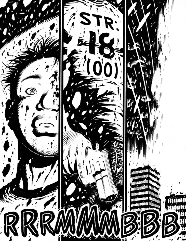 Tried somethin' different with this page's RRRMMMBBB sound FX by adding an open white core to my usual blocky black FX (hand-)lettering. Not sure if successful, but definitely worth trying out.