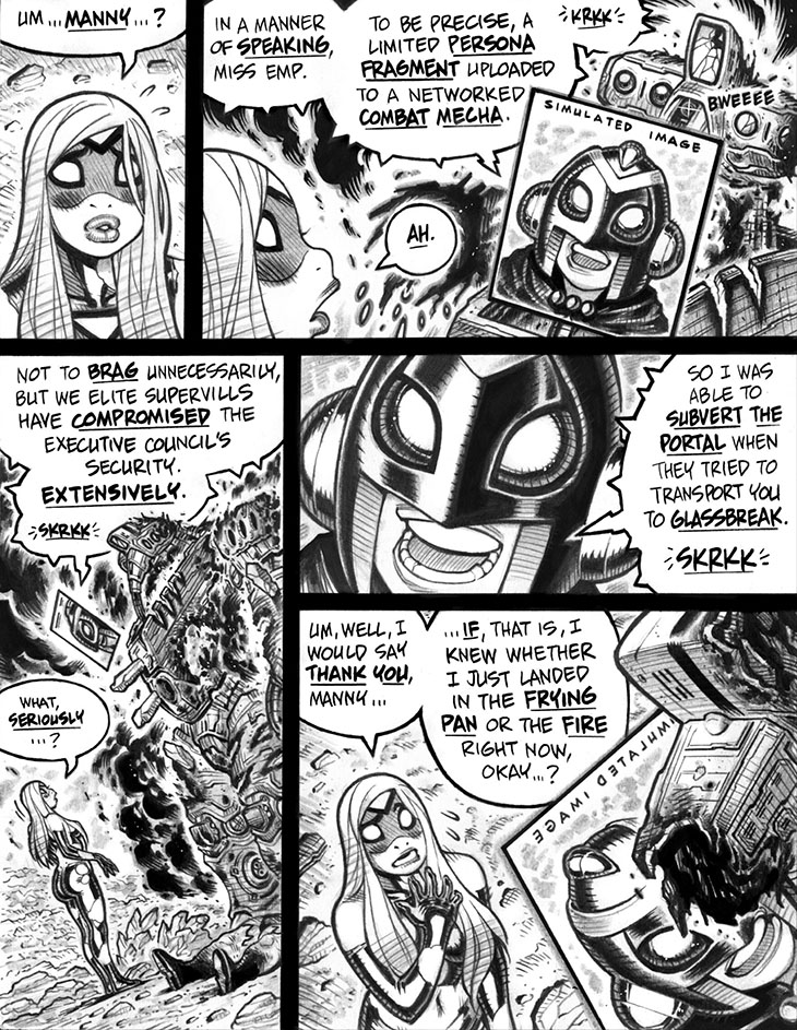 Yes, folks, the familiar mecha belongs to Manny, the cognitively xenoboosted wannabe supervillain (and serious Emp fanboy) last seen at the end of Empowered vol. 4, when more of his machines were dragging off the defeated bad guy Fleshmaster (aka dWARf!) through a Lotus Nodes portal.