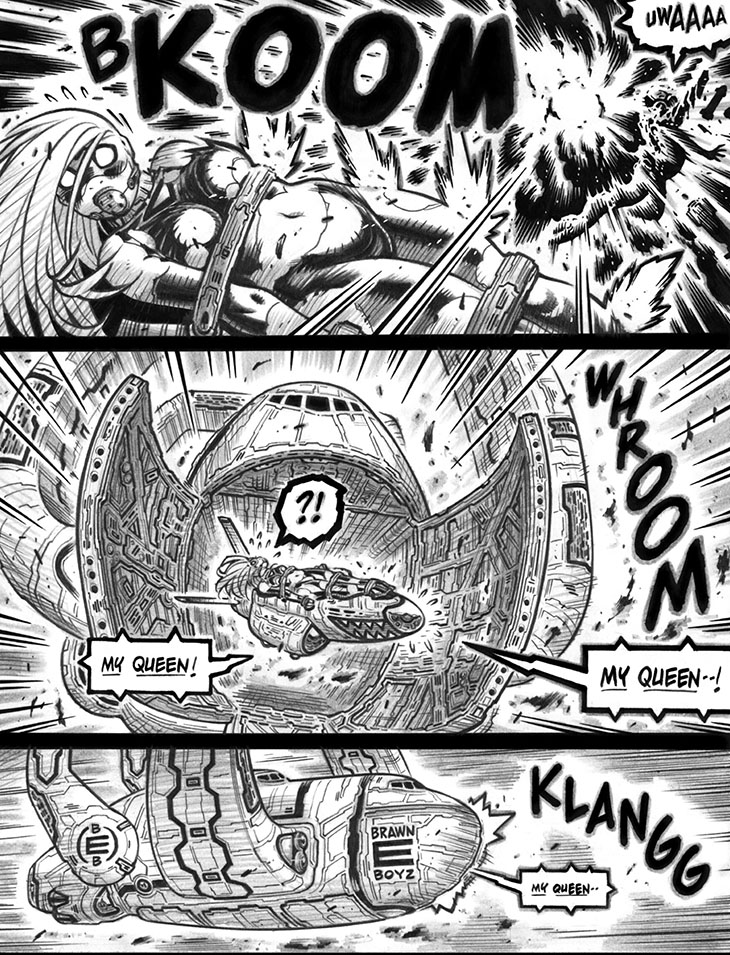 Panels 2-3: That's a rather odd but interesting design for the somewhat wacky-looking aircraft, though at present I can't begin to tell you if it's influenced by some other, now forgotten hardware design, or if I created the dang thing entirely "off the top of the dome." (The latter is possible, for whatever that's worth.)