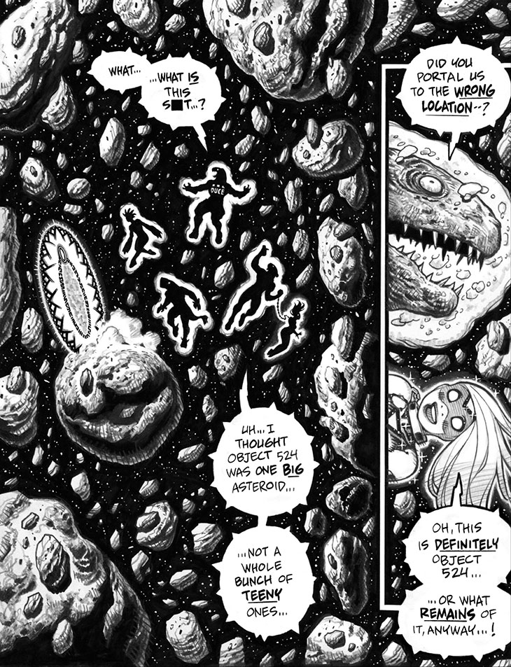 Panel 2: The particular type of panel gutter that I used on this page works well with the characters' word balloons but, as you'll see, I tried out a bunch of different gutter variations before settling on a final form after a few pages.