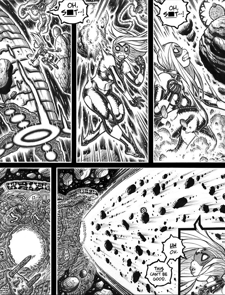 Panel 4: Note that the alien war machine boasts a "hammerhead" design riff not unlike the one seen on my 1992(3?) SimHell redesign of the starship Lovely Angel from my version of Dirty Pair. I'm fairly sure that I first picked up that riff circa high school in an obscure Rick Sternbach ship design from the 1979 Star Trek Spaceflight Chronology book. I was by no means a Star Trek fan at any time in my life, but I did find that book oddly appealing.