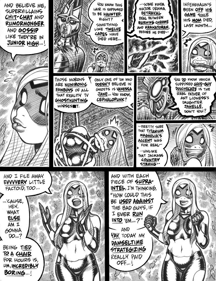 Yeahp, panels 2 through 7 depict the various occasions of distressed damselhood during which Emp picked up the intel she used to manipulate the unnamed team of bad guys fifty pages ago. Huzzah!